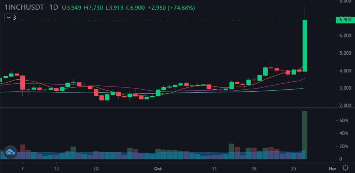바이낸스 기준 1inch Network 가격은 약 6.8 USDT입니다 원화로 계산하면 약 7,956원입니다