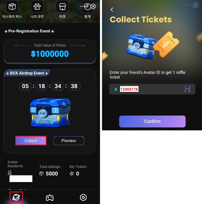 : 친구의 아바타 아이디를 입력하여 1개의 추첨권을 받으세요