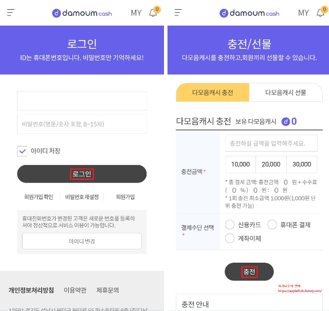 동의하기-> 충전하기-> 다모음캐시 회원가입-> 충전금액 입력-> 충전을 누르시면 됩니다