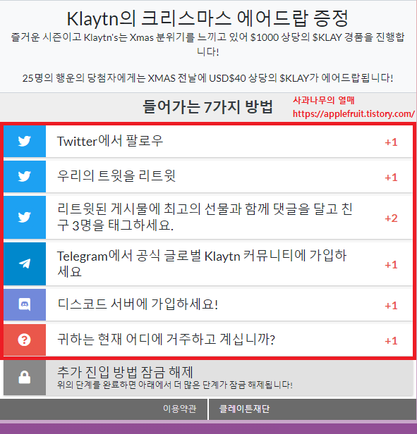 에어드랍 이벤트 트위터 : https://twitter.com/klaytn_official/status/1473224502251249675