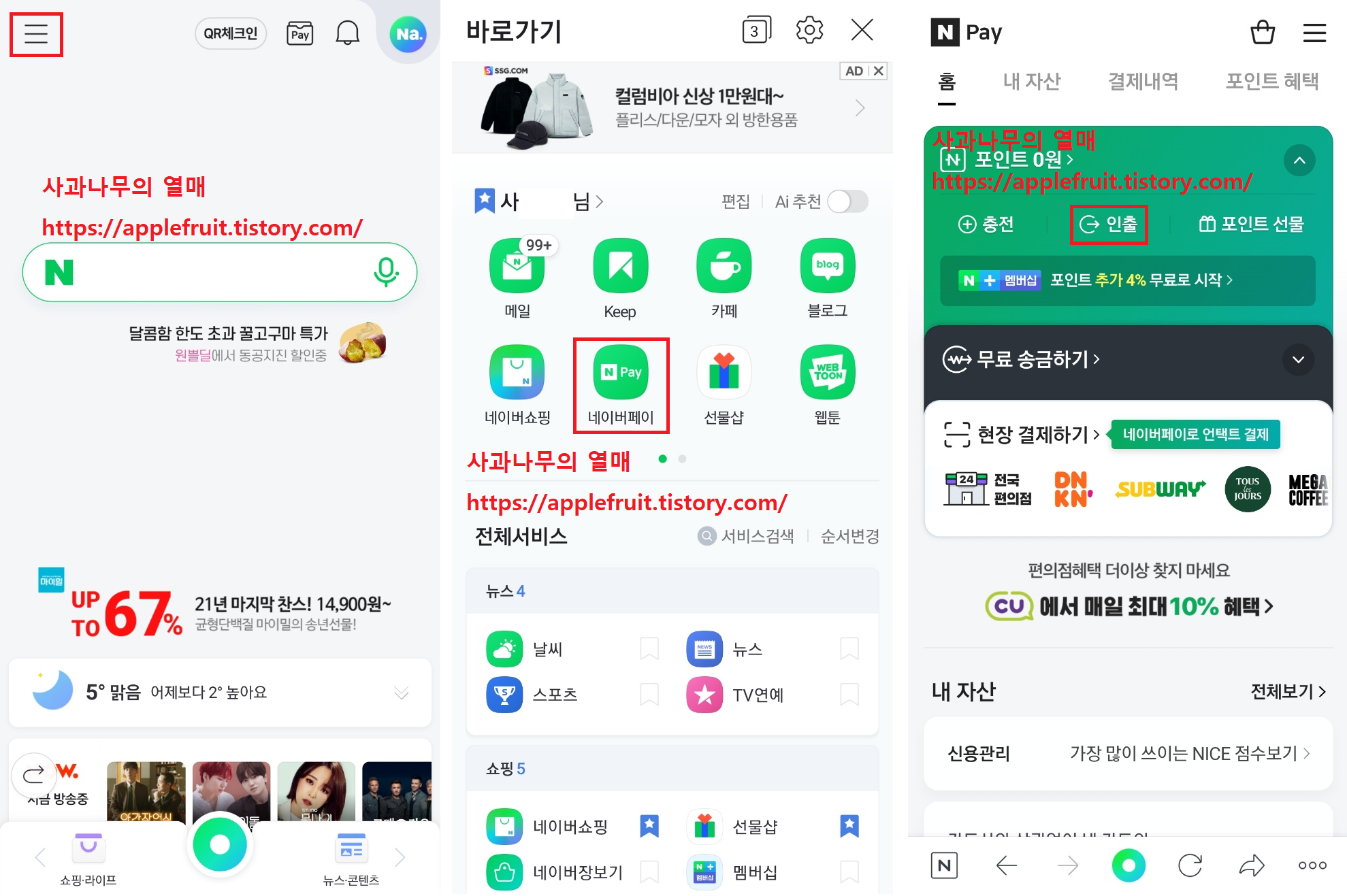 왼쪽 상단에 세줄 모양을 눌러주신 후 나오는 화면에서 네이버 페이 아이콘을 클릭해 주세요