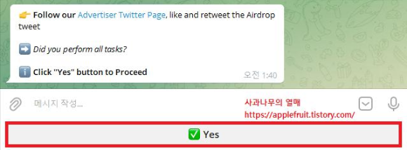 트위터 팔로우, 리트윗을 진행하신 후 아래 Yes버튼을 눌러주시면 됩니다