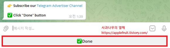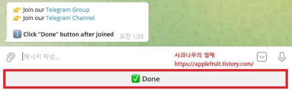 4. 아래 텔레그램 채널에 입장하신 후 Done버튼을 누르시면 됩니다