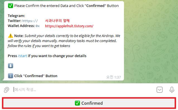 7. 아까 입력한 트위터 주소와 지갑 주소가 나올 텐데 확인하시고 맞으시면 아래 Confirmed버튼을 누르시면 됩니다