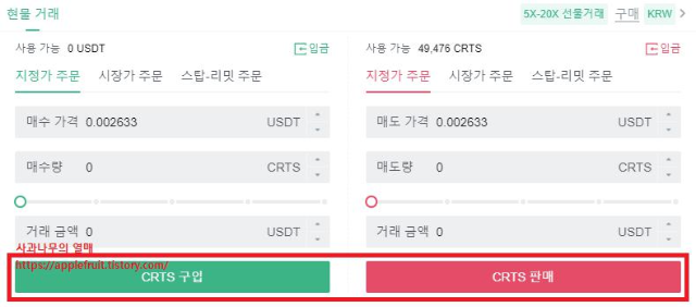 3. 코인을 선택 후 아래를 보시면 지정가, 시장가 등 기능이 있습니다