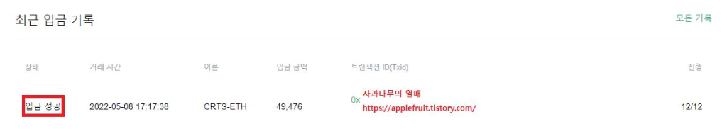 9. 그 후 일정 시간이 지난 후 거래소 최근 입금 기록을 보시면 정상적으로 들어온 것을 확인할 수 있습니다