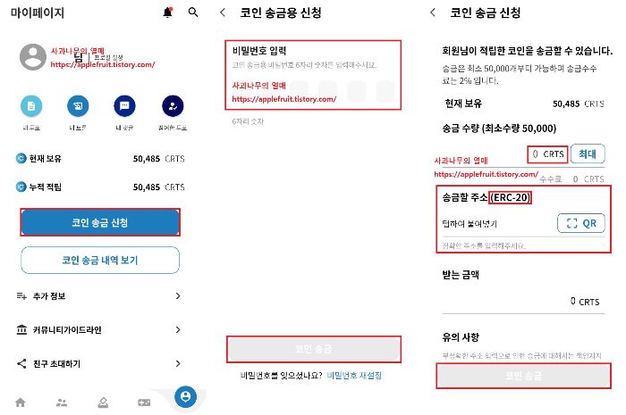 8. 송금 내용을 확인 후 코인 송금 신청 버튼을 눌러주세요