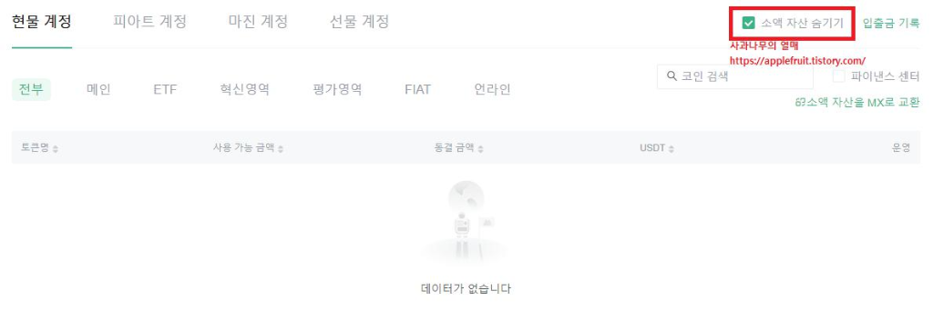 오른쪽에 보시면 소액 자산 숨기기에 체크가 되어 있을 텐데 체크를 해제해주시면 됩니다