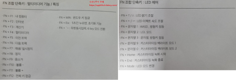 제품 보증서 용지를 보시면 단축키(FN, LED)에 관한 설명이 나와있습니다