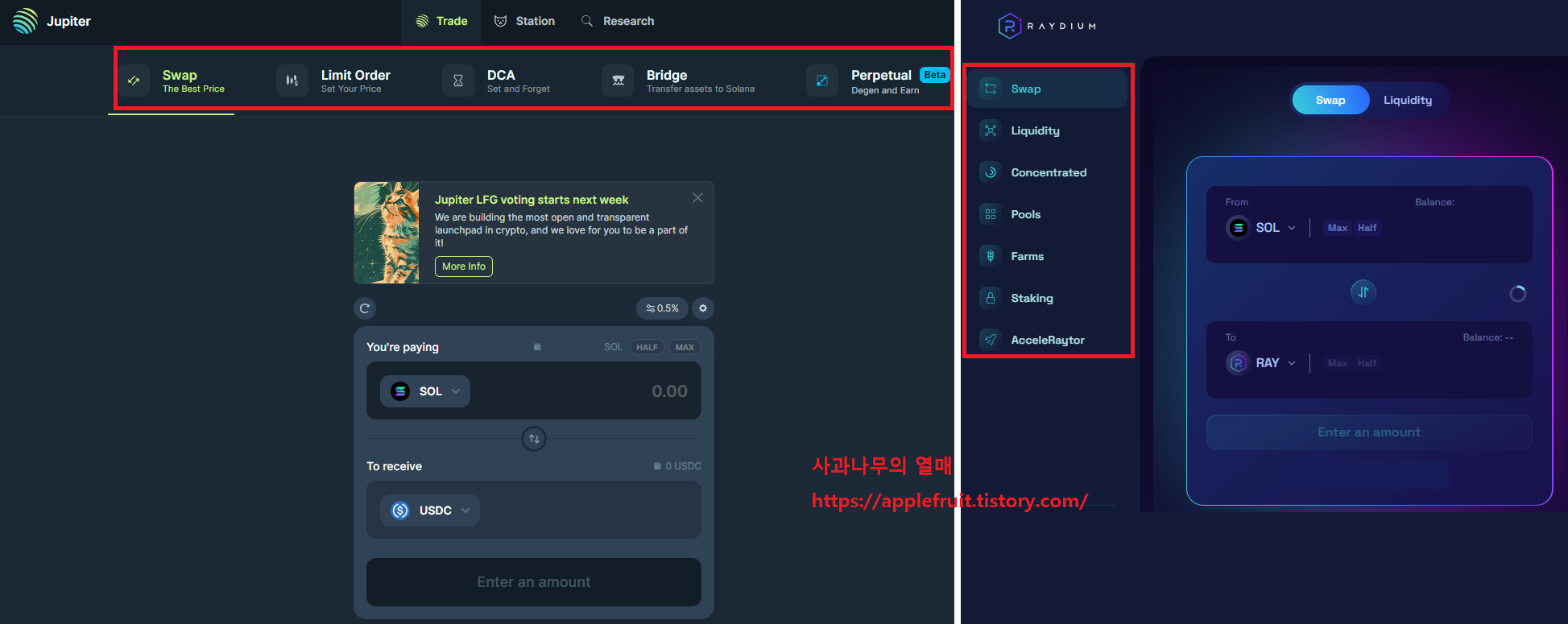 왼쪽이 Jupiter, 오른쪽이 Raydium입니다