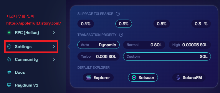 클릭하신 후 Slippage, 거래 우선순위, 기본 탐색기를 설정할 수 있습니다