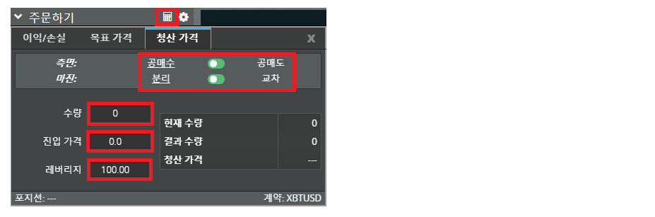 주문하기 옆에 계산기 버튼을 누르면 청산 가격을 계산할 수 있는 창이 뜹니다