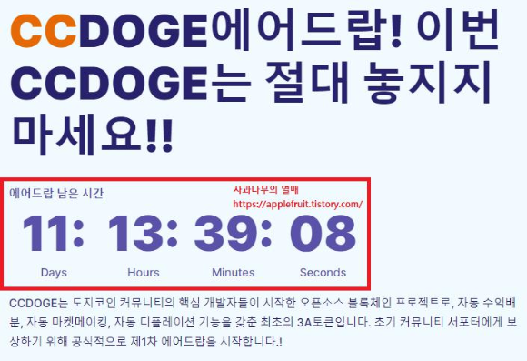 2. 왼쪽을 보시면 에어드랍 남은 시간과 CCDOGE에 대한 설명이 있습니다