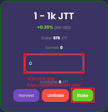 클릭 후 Stake를 할 개수를 입력한 후 밑에 Stake를 누릅니다