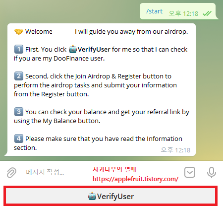3. 내용은 에어드랍에 대한 간단한 설명입니다 확인하시고 아래 VerifyUser을 눌러주세요