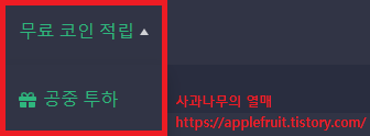 10. 그 후 다시 사이트에 들어가셔서 상단 메뉴에서 무료 코인 적립-> 공중 투하를 눌러주세요
