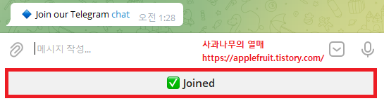 Telegram channel을 눌러 들어가신 후 아래 Joined를 누르시면 됩니다