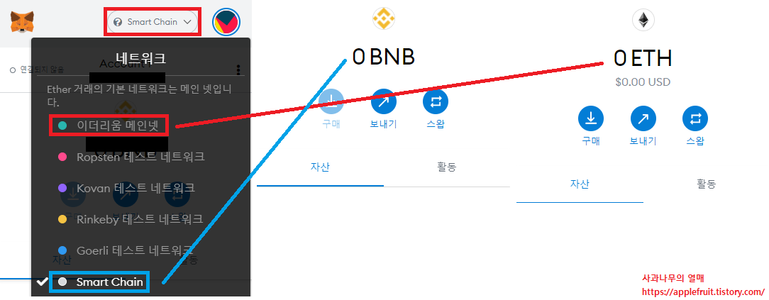 이더리움 메인넷을 클릭하면 화면에 ETH가 보일 것이고, Smart Chain을 클릭하시면 BNB가 보입니다