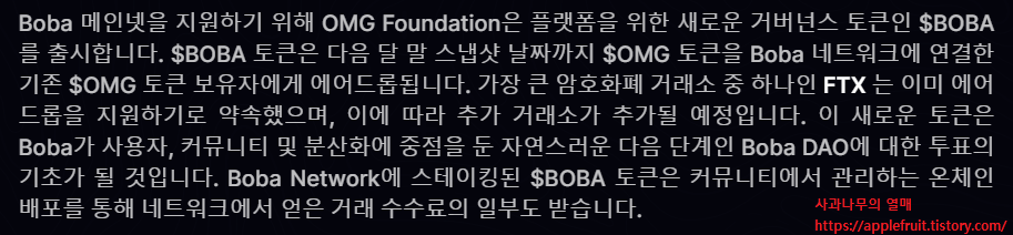 아직 정확한 날짜는 나오지 않았지만 아래 내용을 보시면 OMG를 보유하고 있는 사람에게 보바 토큰을 에어드랍 해주겠다는 내용입니다