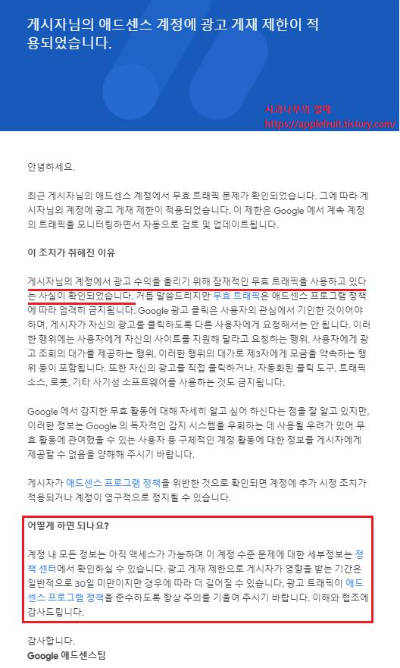 아래를 보면 "게시자님의 계정에서 광고 수익을 올리기 위해 잠재적인 무효 트래픽을 사용하고 있다는 사실이 확인되었습니다"게 이유였다