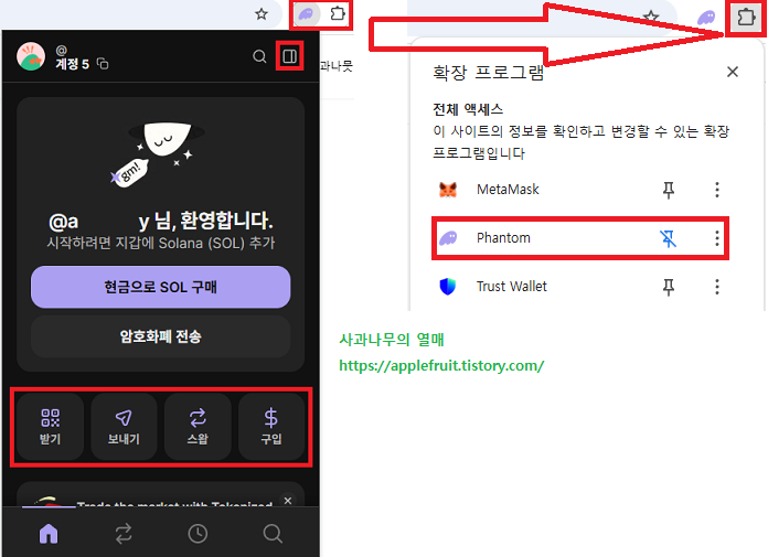 3. 팬텀 지갑이 설치가 완료되셨으면 아래 사진을 참고하셔서 따라 하시면 됩니다